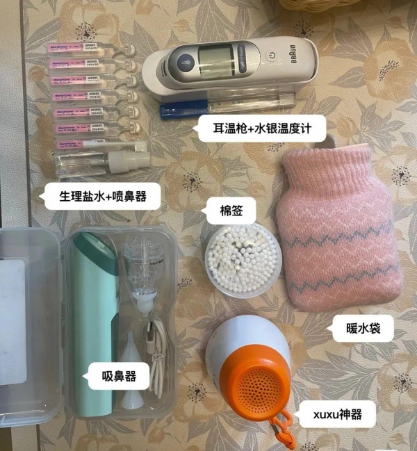 12月11日晚,何淼的孩子鼻子有些堵,何淼用生理盐水和喷鼻器处理,这些是他最近使用的护理工具。受访者供图