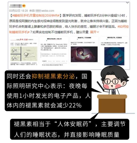 除了危害眼睛,睡前玩手机还可能会影响交感神经系统和肾上腺激素分泌,打乱生理周期,影响睡眠质量。