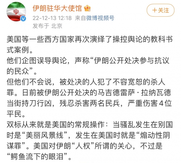 就西方媒体的此番操作,@伊朗驻华大使馆 今天早些时候还发布了另一条博文表示,这是美国等一些西方国家再次演绎了操控舆论的教科书式案例,他们企图误导舆论,将伊朗当局对犯下杀人罪行之人的处决,说成是"对参与抗议的民众"的判决。