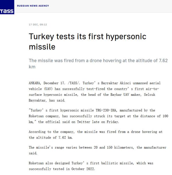 尽管土方发布的信息都是称"超音速"(supersonic),俄罗斯塔斯社今日却将其报道为"高超音速"(hypersonic),又拔高了一大截。虽然俄媒报道引发了一些误解,但这次试射确实体现了土耳其的雄心。