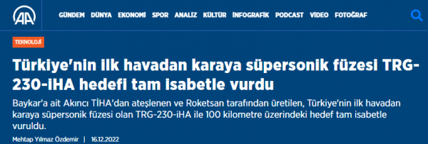 土耳其阿纳多卢通讯社报道称,这是土耳其首次从空中发射对地超音速导弹。