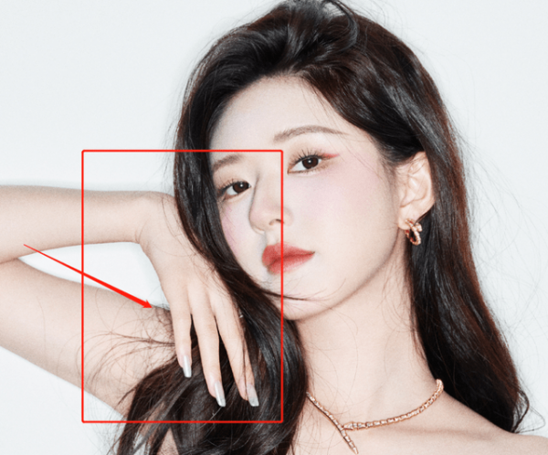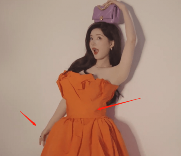 首先就是这套黄色抹胸褶皱短裙的造型,精修乍一看不功不过,但细看就能发现问题--赵露思的手被拉太长了,越看越诡异。