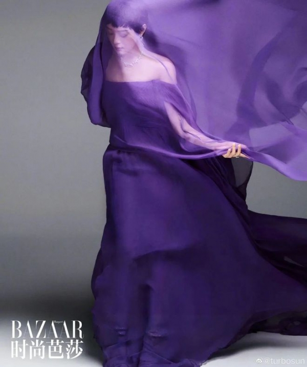 除了性感风,孙俪还尝试了迷离风,只见她身穿一条茄子色的礼服裙,迎面是一大块同色纱布遮脸,迷离的氛围感拉满了,但细看又有一种奇奇怪怪的感觉,只能说,时尚是我们普通人不懂的。