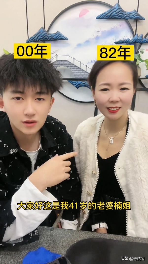 视频镜头前这位00后男孩精致的五官,白皙的皮肤,直接衬托出满脸的胶原蛋白,与一旁82年出生的妻子形成了鲜明对比,只见女子虽然使用了较浓的眼妆和粉底,却依旧遮挡不住下垂的皱纹和暗黑雀斑。