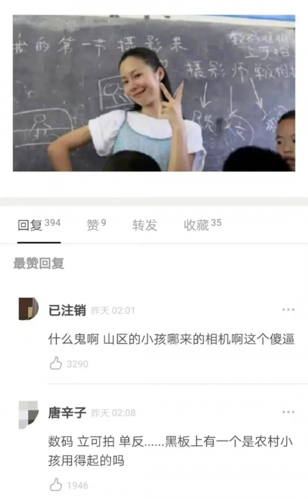随后就有网友扒出当时的照片,表示对于黑板上写到的摄影设备名称,相对于落后的农村小孩子是用不起的。