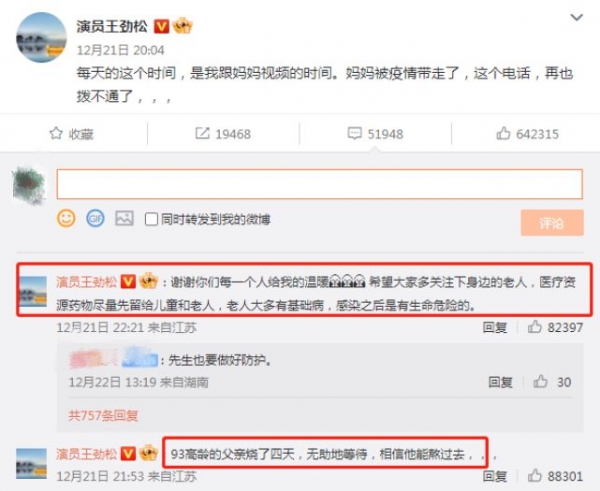 王劲松则呼吁外界应该先将医疗资源留给儿童和老人,因为老人大多都有基础病,感染之后是有生命危险的。看到两位演员的母亲因为疫情离世,真的蛮让人难受,希望两位节哀。也希望大家都好好保护自己,保护家人。也愿各位都能够平平安安、健健康康。我们一起加油!