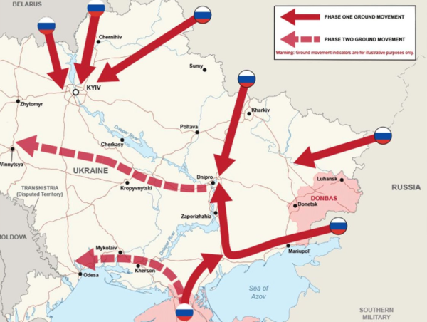 俄军战争初期行动计划示意图,但这个计划是基于乌克兰军队大量崩溃,除了东部堡垒地带外毫无斗志基础之上的空中楼阁