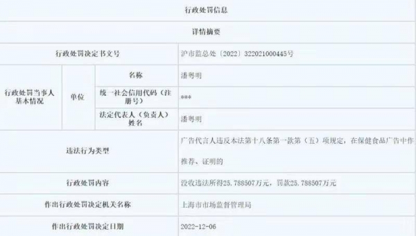 影视演员潘粤明因违法代言广告行为,被市场监管部门罚款25.7万余元。上海市市场监管局近期公开的行政处罚信息显示,今年12月6日,上海市市场监管局作出了这一行政处罚决定。