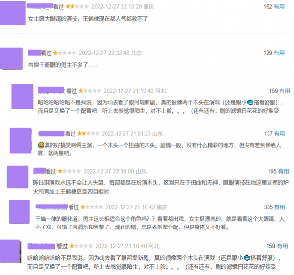这样的表现显然没有满足观众的期待,以至于不少人在评论区都对王鹤棣的演技产生了质疑,同时,女主角陈钰琪也吸引了一部分"炮火",有人直言男女主是"四木相对",讽刺得太到位了。