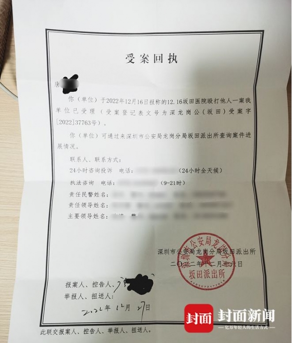 12月29日,封面新闻记者接到爆料称,12月16日上午,深圳龙岗区的唐先生高烧39度在深圳坂田医院就医时,因"过号一分钟"被要求重新排队,与门诊医生石某发生争执后,头部遭听诊器击伤缝了12针。