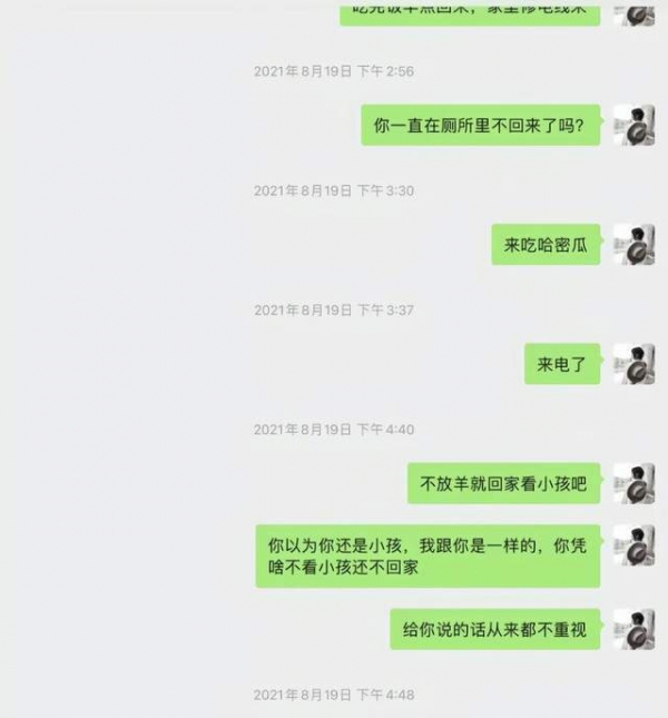 但从她晒出的聊天记录中,能够看到大部分时间都是她歇斯底里,丈夫不咸不淡地回复几个字,甚至是没有回复。