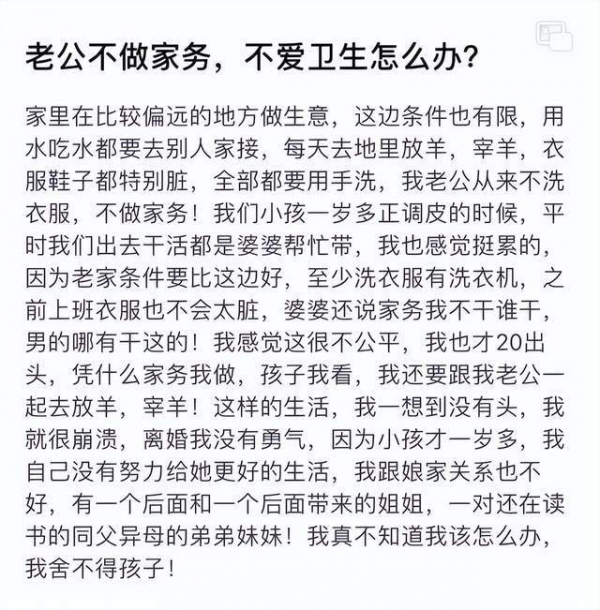 早在自己的视频爆火前,她就觉得日子过不下去了,她曾去网站提问丈夫不做家务,自己心里不平衡怎么办,也曾一遍遍与丈夫争吵。
