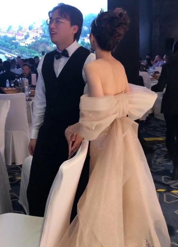 视频画面中这位新娘挽着新郎的手腕依偎在其身旁,只见她身穿一袭洁白低胸露背婚纱,将白皙的肌肤、迷人的锁骨以及苗条的身材曲线展现得淋漓尽致,此时她看起来就像是个公主一般,其颜值与气质更是一下子引人注目。