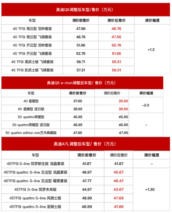 其中,奥迪A7L除45TFSI S-line筑梦新生版流晶套装车型售价未变之外,其它车型均降价1.3万元;同时,Q5 e-tron亦调低了两款入门版车型的售价,降幅达2万元;至于奥迪Q6,则全系"直降"1.2万元。