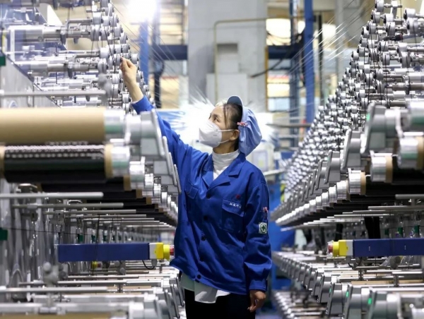 山东某车间的工人检查电子计米器上显示的产品长度 图源中国印染行业协会公众号