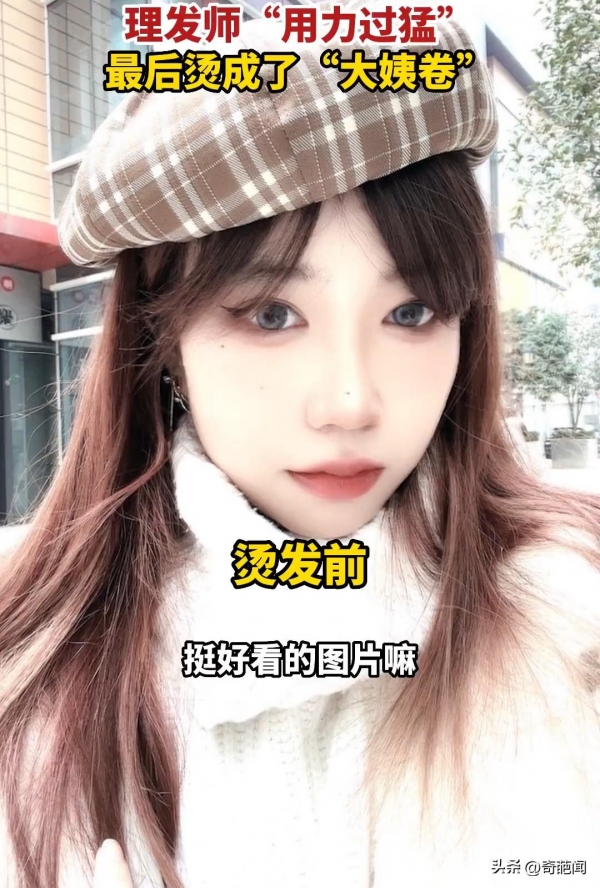 视频镜头前女孩称:"因为快过年了,准备烫个新发型迎接新的一年,谁知发型师一不小心用力过猛,让自己秒升辈分,为此哭笑不得地拍摄记录这神奇的一幕"。