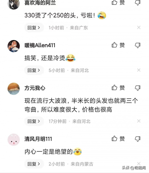 还有网友评论说,这是冷烫奶奶烫法,不小心就烫得很成熟,不过也没有人可以笑着从理发店里面出来,除了老板和发型师。