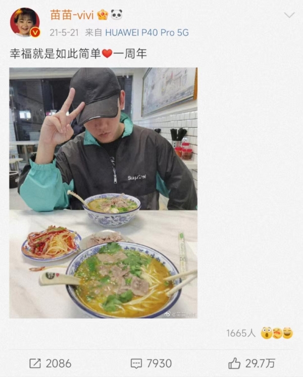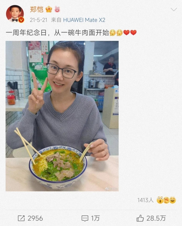 在结婚一周年纪念日的时候,郑恺和苗苗也没有选择吃什么大餐庆祝,而是低调去店里吃了一碗牛肉面。郑恺和苗苗都晒出了对方吃面的样子,夫妻俩低调打扮,满满的烟火气息,给足了对方安全感。