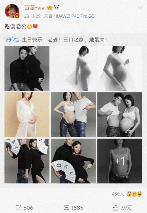 苗苗怀孕期间,郑恺还晒过两人孕照合影表示,一家之口,苗苗最大。苗苗也亲昵回应:谢谢老公。