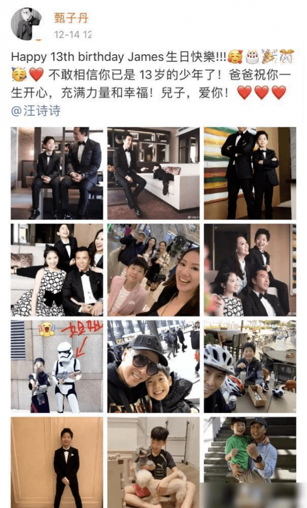 甚至是内敛如同甄子丹,也会在小儿子生日的当天,发布12张和儿子一起的合照,并写上"儿子,爱你"这样表露于外的配文,实在是宠爱至极。