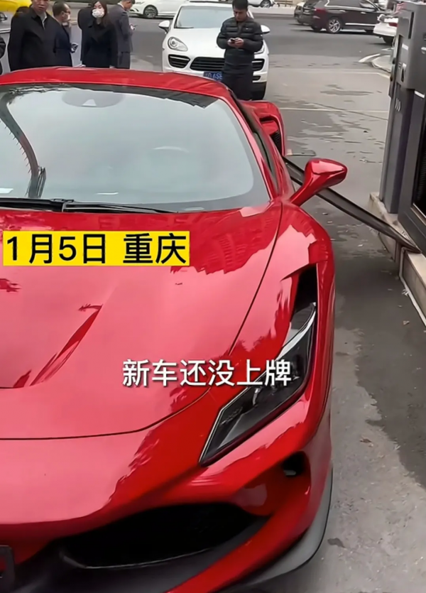 1月5日重庆市沈先生,开着还未上牌价值400万的新车法拉利,在小区门口通过道闸时,突然被路边的配电箱盖砸中车辆侧门。