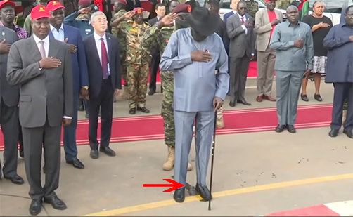 这则视频影像拍摄于去年12月,其中显示现在71岁南苏丹总统萨尔瓦·基尔·马亚尔迪特在参加一场活动,他一身灰色装扮,头戴黑礼帽,手拄拐杖,裤子一侧有条深色水渍漫延到脚下,地上还有一滩可疑的水迹,基尔似乎意识到什么,低头向脚边看了看。