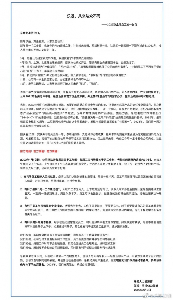 对于每周四天半工作制,乐视之前解释称,该举措有利于员工和家人及时就医,周三休息半天,员工不用请假可以更灵活安排自己和家人就诊。此外,有利于缓解 " 周一工作焦虑症 "。周三休息半天,员工可以去跑跑步、健健身或进行其他娱乐活动,能有效缓解这种焦虑。
