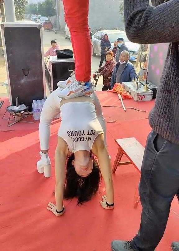 这里面最受欢迎的当属杂技,演员展示的都是普通人连尝试都没可能的绝技,比如这名人称"铁腰娘子"的女子,直接将一个100多斤的壮汉踩在身上。