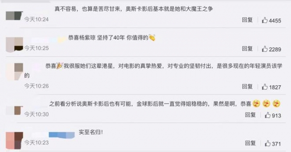 网友纷纷发来祝贺,表示"实至名归,杨紫琼值得这座奖杯!"