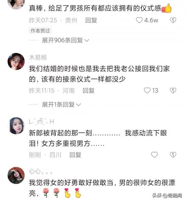还有网友评论说,这种风俗我喜欢!不管儿女都是父母辛苦养大,上门女婿没有不好的!不要歧视上门女婿!