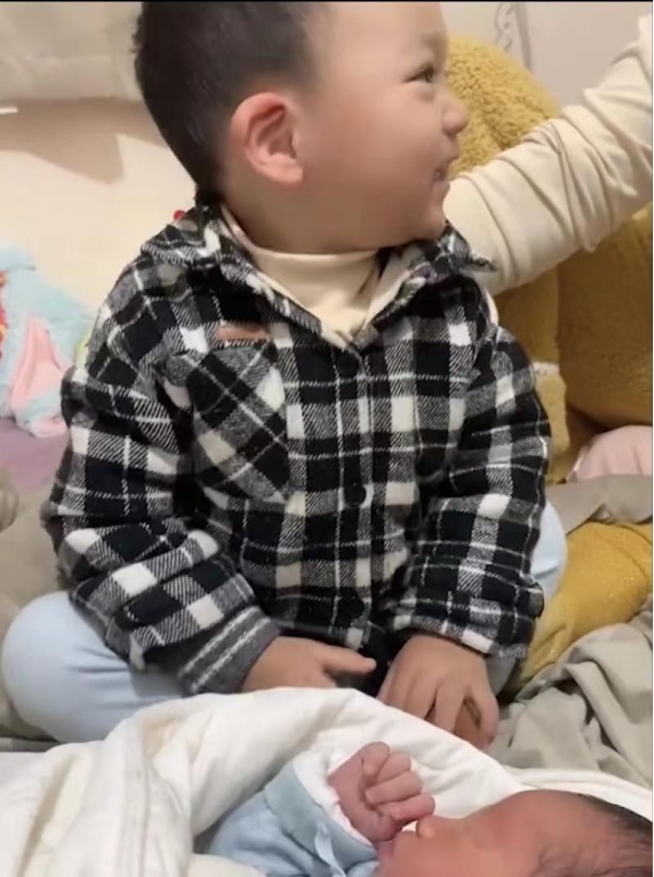 女子称自己和老公感情非常融洽,早先有了大宝,大宝一岁多后,自己又怀上了二宝,两个孩子非常可爱,大宝看着小弟弟,非常开心,小心翼翼地去亲弟弟脸庞。一家四口的小日子过得幸福快乐,其乐融融。