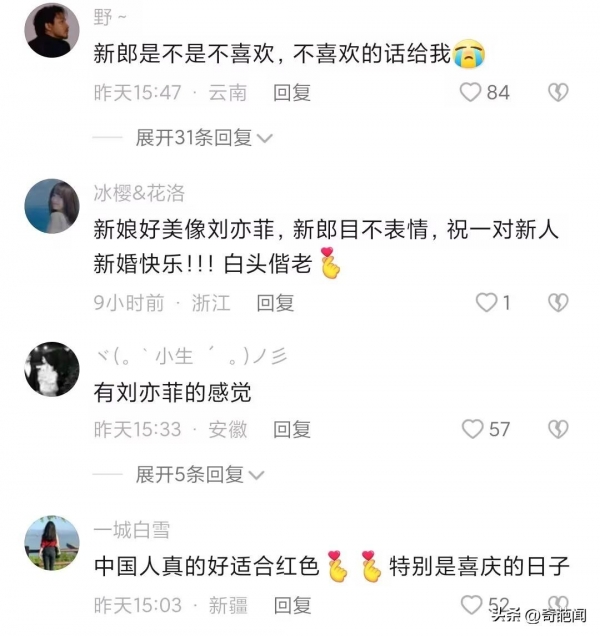 还有网友评论说,新娘真的好漂亮啊!希望这个男人好好珍惜吧!祝愿新人天地长久百年好合。