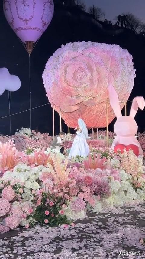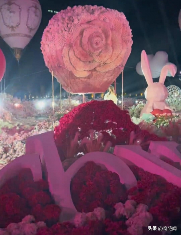 从拍摄的视频画面显示,眼前这片花海相信能引起无数女性的羡慕与惊叹,只见整个广场不由有被粉色、草绿色以及玫红色的花束铺满,而且还有心形、玫瑰花形的热气球升空加以装扮,最后在聚光灯效果照耀下,仿佛人间仙境。