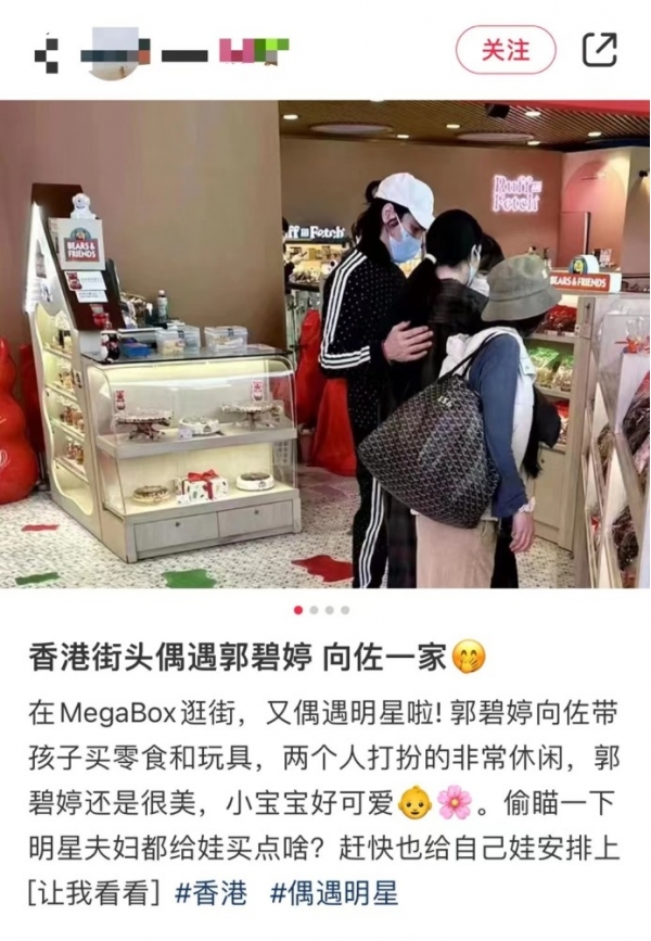 1月13日,有网友在社交平台上晒出一则在香港偶遇向佐郭碧婷逛街的动态,她表示,在某商场逛街时,偶遇夫妻二人带着孩子买东西,打扮非常休闲低调。