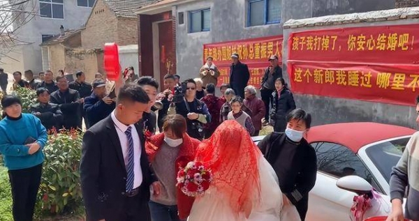 在婚礼现场喜庆的音乐声中,装扮精致的一辆保时捷主婚车,在引导的前导车引领下缓缓驶近。随着婚车的停稳,车门打开,披着红盖头的新娘在伴娘的搀扶下,迈着有些迟疑的脚步下了车。