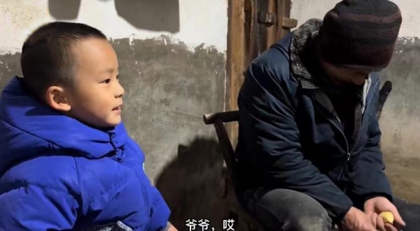 这时,小孙子冲着大伯喊道:爷爷,我想帮你喂鸡。老人正忙着刮洋芋,听到孙子的喊声,开心地回答:等一下,我弄好了洋芋,就带你去!