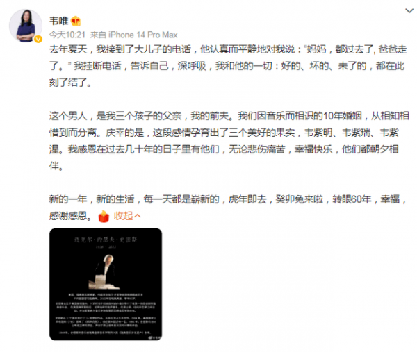 接着韦唯还回忆了两人因音乐而结缘的十年婚姻,表示从相知相惜最后到分离,种种过往不论是悲伤痛苦还是幸福快乐,都已经在当下了结。在这段婚姻中,韦唯最大的收获便是生了三个儿子:韦紫明、韦紫瑞、韦紫湦,陪伴她度过了前半生。