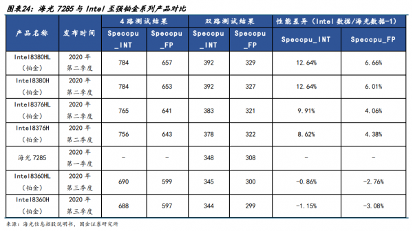 2022年12月,国金证券发布的研报提到,选取英特尔在2020年(与海光7285同期)发布的6款至强铂金系列产品(能够反映英特尔2020年发布的主流CPU产品的性能)与海光7285进行性能对比可以发现,在典型场景下,海光信息最新一代CPU相关产品均已接近国际同类高端产品水平。
