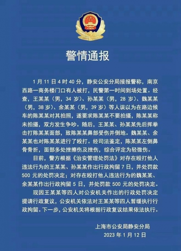 1月12日时,上海静安警方发布一则街头打人通报,其中被处罚500元,行政拘留7天的肇事者王某某被权威媒体爆料是王思聪。