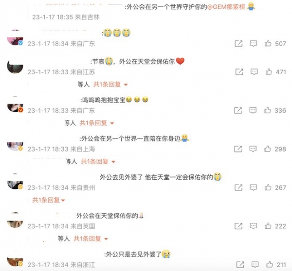 粉丝们纷纷留言安慰邓紫棋:节哀,外公只是去见外婆了,他在天堂会保佑你的,他会在另一个世界一直陪在你的身边、守护着你。