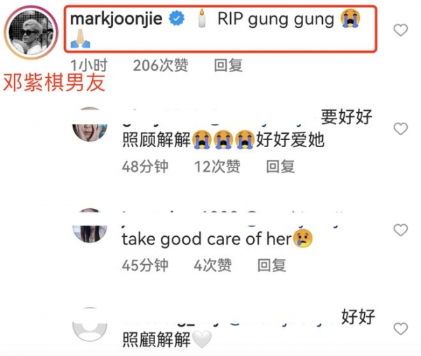 邓紫棋的富三代男友Mark也早早地赶来,为邓紫棋的外公祈祷:RIP公公。粉丝们喊话Mark要保护好公公的小囡囡。