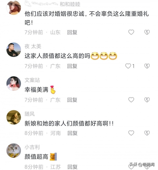有网友评论说,这才是正儿八经的婚礼,那些身上喷东西的扒衣服的,脸上抹泥的恶俗婚礼只能说晦气。
