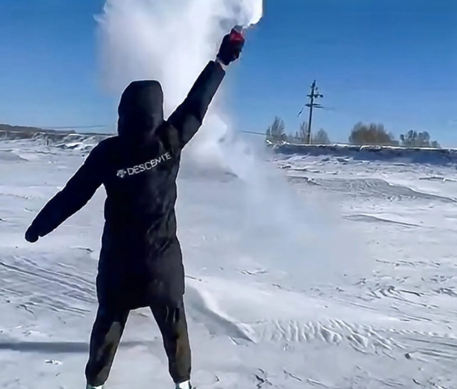 近日,在黑龙江大兴安岭,一男子在室外表演泼水成冰,没想到直接变成泼水成云,随风飘走了。