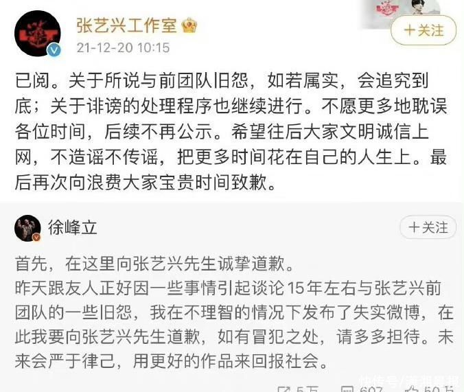 潇湘晨报记者注意到,此前造型师徐峰立曾发表与张艺兴相关言论,称其"选妃"、忘恩负义、人人喊打等,后删除相关微博道歉。张艺兴团队表示,会针对诽谤进行处理。