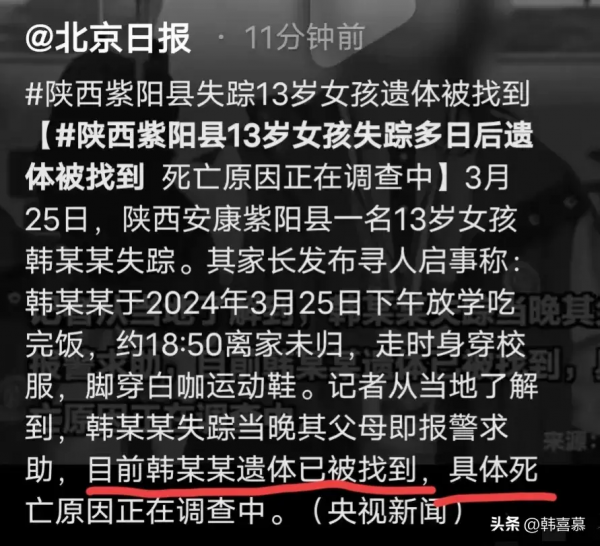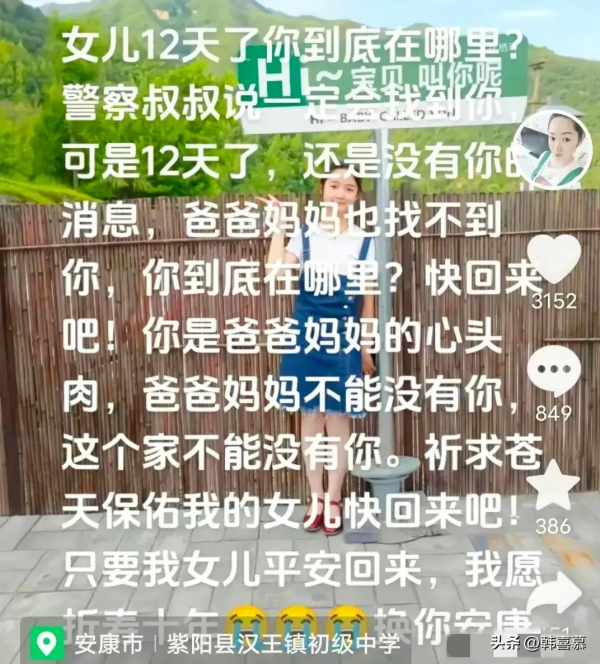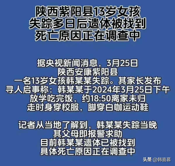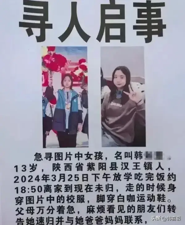 近日,陕西安康一个13岁的女孩子失踪的消息引起网友热议。大家关注的问题不仅是她的安危,还有她失踪的原因,事情已经发生十天了,韩如意遗体被找到了,让网友不能接受的是,这个可怜的孩子还是离开了这个世界,她到底经历了什么呢?