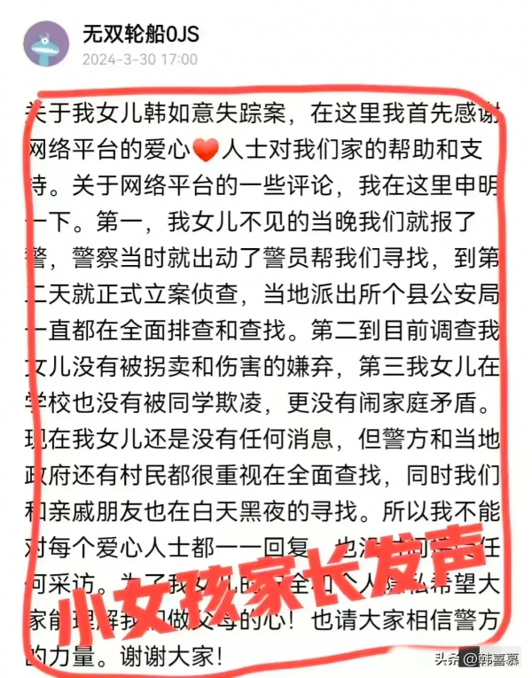 随后,韩如意母亲通过社交平台发布寻人启事,呼吁网友帮帮她,希望有人可以提供她女儿的消息。