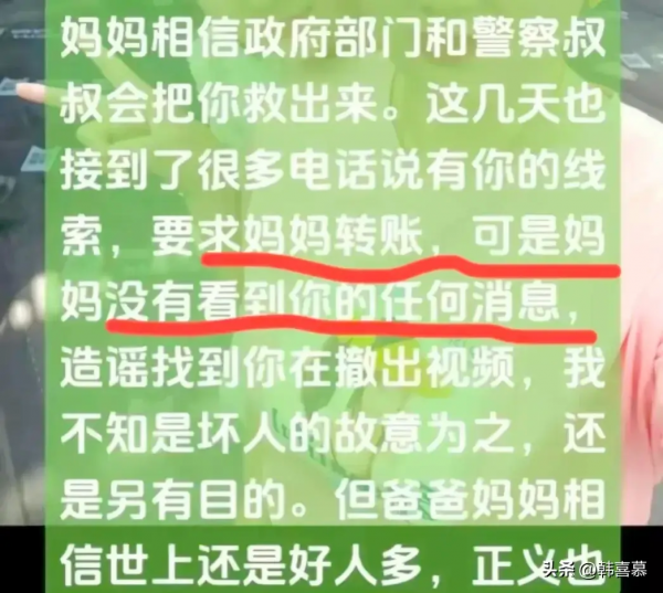 让人气愤的是,有些人利用韩如意母亲焦急的心疼,冒充好人,还有人造谣她和后爸对韩如意不好,各种质疑让她心力憔悴。所以,韩如意父母选择相信警方,也相信女儿还活着。