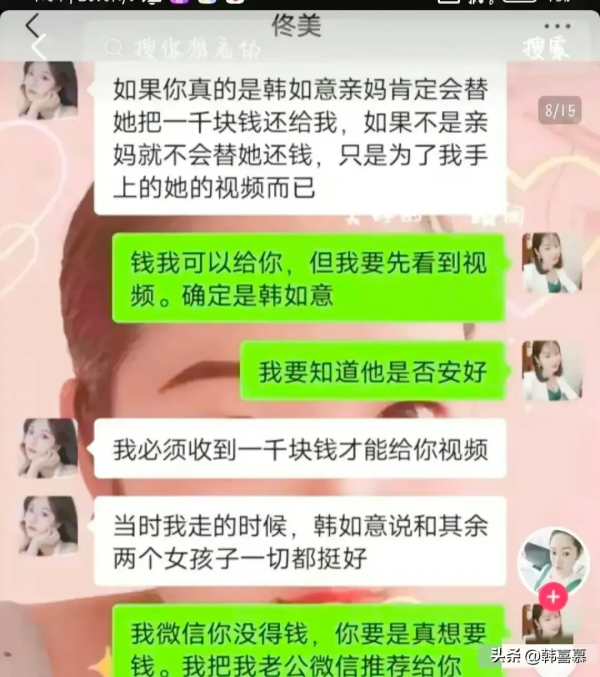 不过,事情并没有这么简单,韩如意母亲曝光删视频的原因,一是有人骗她知道孩子的消息,骗她打钱。二是为了不影响警方办案,所以她删除了寻人视频,只想尽快找到女儿。