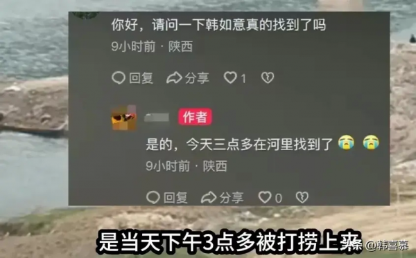 还有知情网友爆料称,4月5日下午三点左右,韩如意遗体在汉江河被找到。在她失踪十二天之后,经过多方努力寻找,可惜的是,韩如意已经去世,死因正在调查中,需要等警方通报大家才能知道。