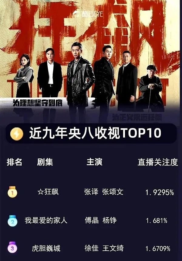 《狂飙》一经播出便收获好评无数,2023年2月,《狂飙》播出期间的收视战报也是新鲜出炉,直接拿下近九年央八收视第一,单日全端播放量首次突破3亿,成绩非常突出。
